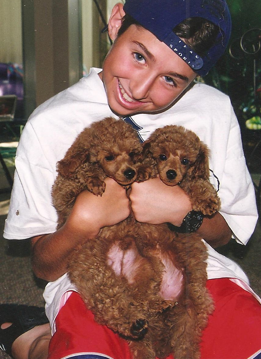 Brett loving his puppies Doodles Left, and Pebbles Right when they first came home