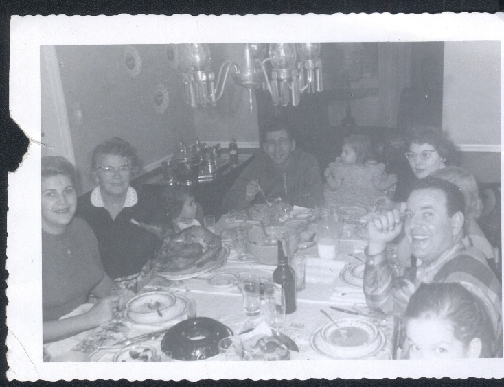 I am the baby in the high chair front center looking at my dad, and Gram was to his right, and to her right was Aunt Doris during a family holiday dinner.
