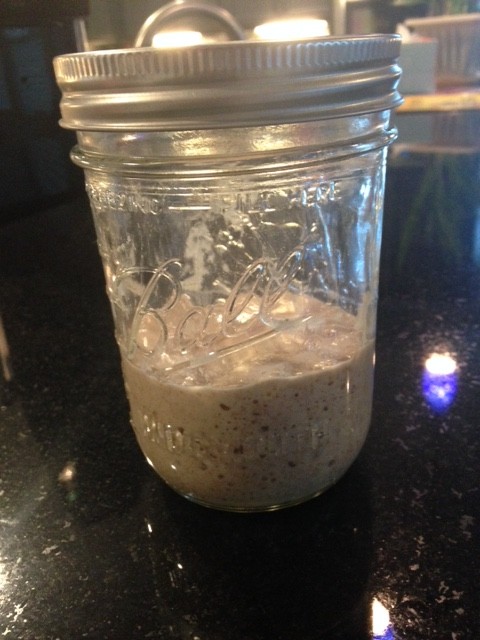 Fortunately, he remembered the smeared frozen starter on wax paper in the freezer and today when I came home, I saw a beautiful new mason jar with his starter. Peering at the jar, I see pocking and bubbling which is a hopeful sign.