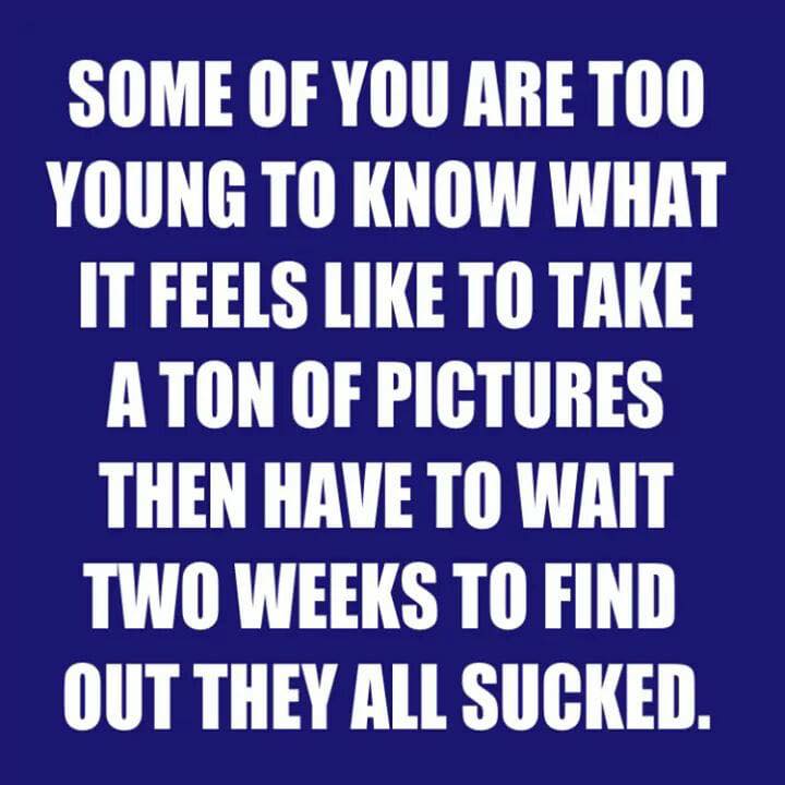 Our own children certainly do not have that problem, as they all had little cameras with film cartridges (or the built in camera and film thingies) and ONE HOUR photo developing while growing up. My daughter has tons of camp photos, and loads of photos from all the fun times of her life.