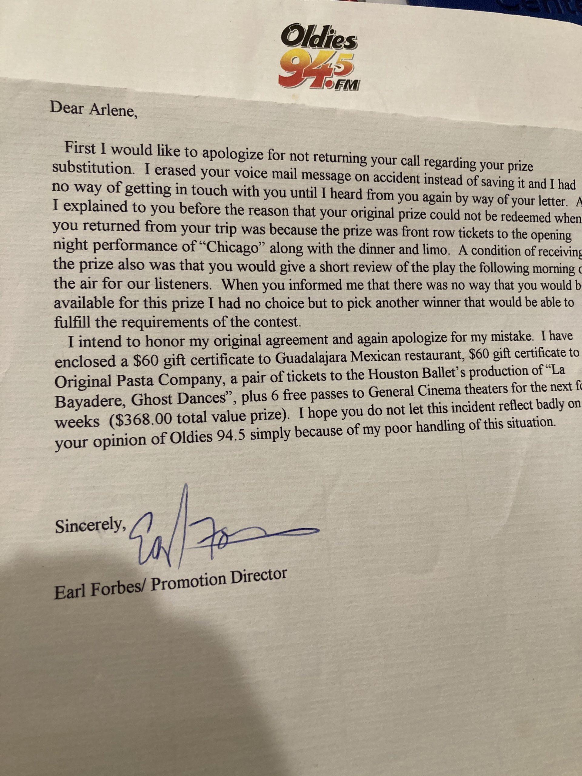 Anyway, after several letters and phone calls were exchanged with the promotions manager upon my return, they finally gave in and gave me as the “original” winner a few coupons good for dinners out. I didn’t complain, yet my name wasn’t announced. No bright lights. Nada.